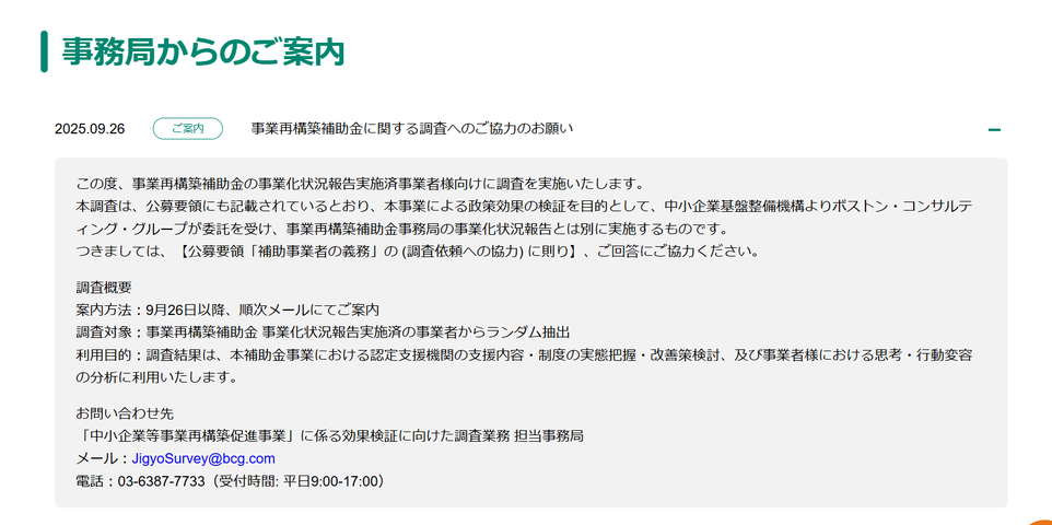 事業再構築補助金の採択をされて、事業化報告をされている事業者様に、突然別のアンケートが届いています。